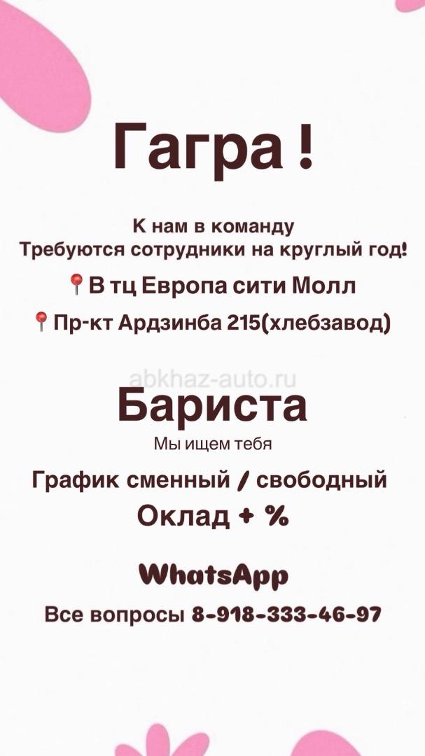 Дополнительная информация: К нам в команду требуются сотрудники. Бариста на круглый год График сменный / свободный Оклад + % Все вопросы по вотсапу