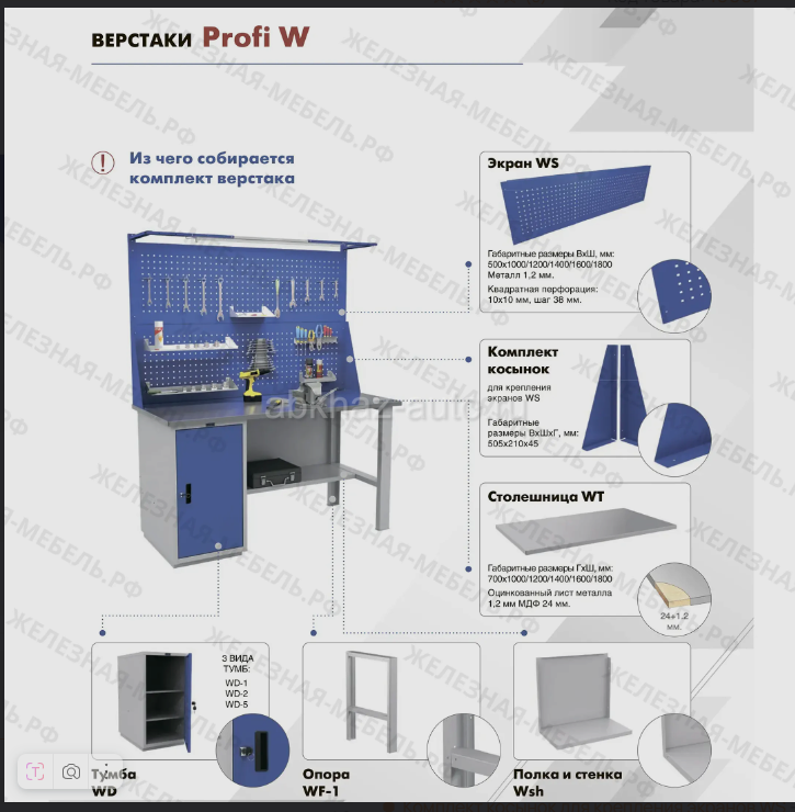 Дополнительная информация: Верстак PROFI W WT160.WD5.WD2.111 предназначен для удобной организации рабочего места на производстве, в учебных заведениях. Толщина металла столешницы, мм 1.2 Толщина дерева столешницы, мм 24 Количество тумб 2 Освещение Есть Количество экранов 1 Габариты и вес ВхШхГ, мм 1370х1600х700 Комплектация: Комплект косынок для крепления экранов WS - 1 шт. Комплект освещения W - 1 шт. Полка и Стенка WSh-160/2 - 1 шт. Столешница WT-160 - 1 шт. Тумба инструментальная WD-2 - 1 шт. Тумба инструментальная WD-5 - 1 шт. Экран для верстака WS-160 (без косынок) - 1 шт. Ящик инструментальный WD-0 - 1 шт. Дополнительно в нашем магазине вы также можете заказать комплектующие для верстаков Profi W: Вес 129,5 кг