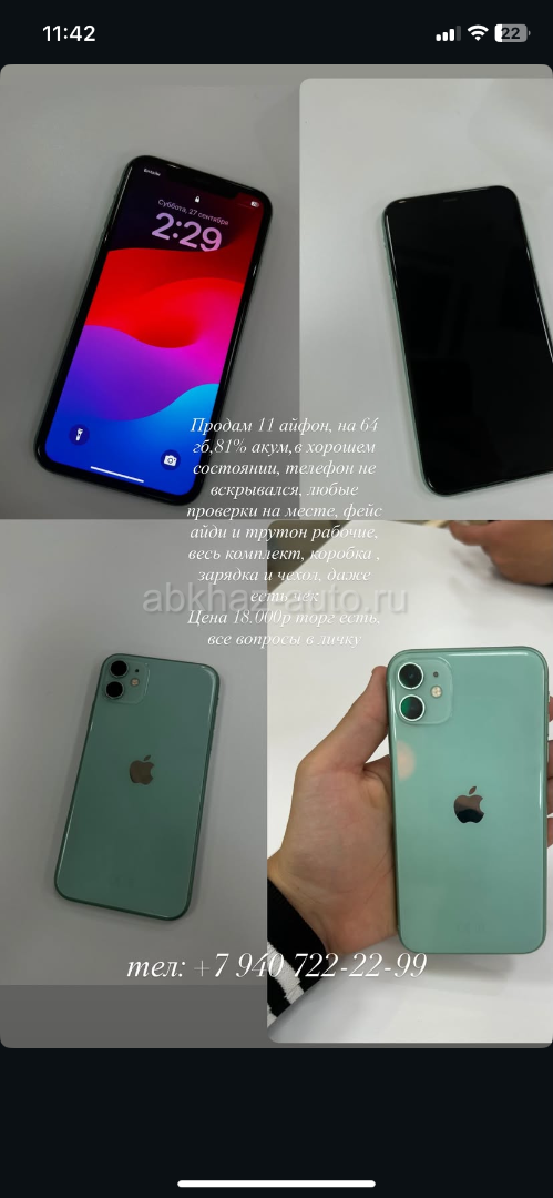 Двигатель: бензиновый, 5.5 л Трансмиссия: автоматическая Кузов: лимузин Цвет: золотистый Пробег: 5 км Год выпуска: 2022 Регион: Гагра Дополнительная информация: Продам 11 айфон, на 64 гб,81% акум,в хорошем состоянии, телефон не вскрывался, любые проверки на месте, фейс айди и трутон рабочие, весь комплект, коробка , зарядка и чехол, даже есть чек Цена 18.000р торг есть, все вопросы в личку