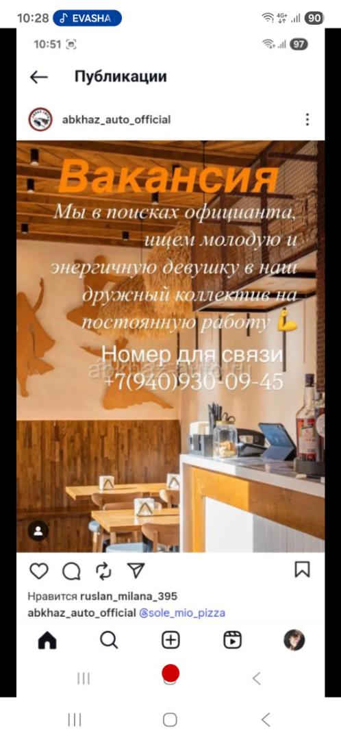 Дополнительная информация: Пиццерия “SoleMio” Сухум ищет официанта молодую, энергичную девушку в дружный коллектив. Все подробности по телефону+7(940)935-47-62 Олеся