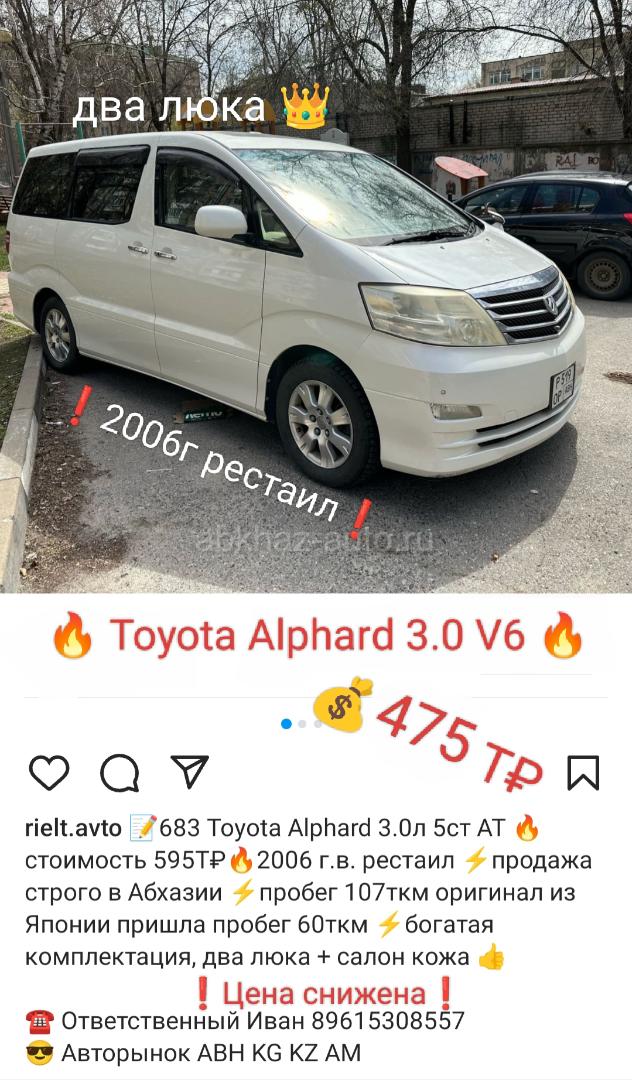 Двигатель: бензиновый, 3.0 л Трансмиссия: автоматическая Кузов: минивэн Цвет: белый Пробег: 107 км Год выпуска: 2006 Регион: Вся Абхазия Дополнительная информация: ❗Цена снижена до 475тр,обмен на деньги❗ Авто в Ростове-на-Дону, приедет в Абхазию когда будет покупатель. Выездная. 📝Toyota Alphard 3.0л 5ст АТ 🔥 стоимость 590Т₽🔥2006 г.в. рестаил ⚡продажа строго в Абхазии ⚡пробег 107ткм оригинал из Японии пришла пробег 60ткм ⚡богатая комплектация, два люка + салон кожа 👍 ☎ Ответственный Иван 89615308557