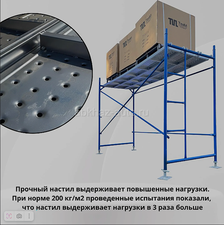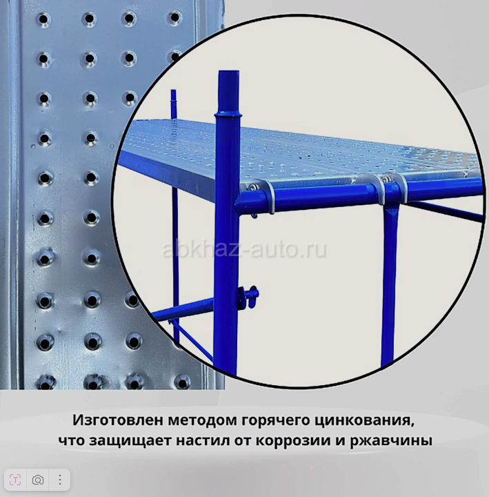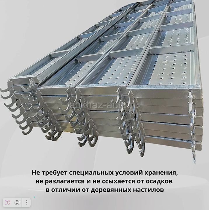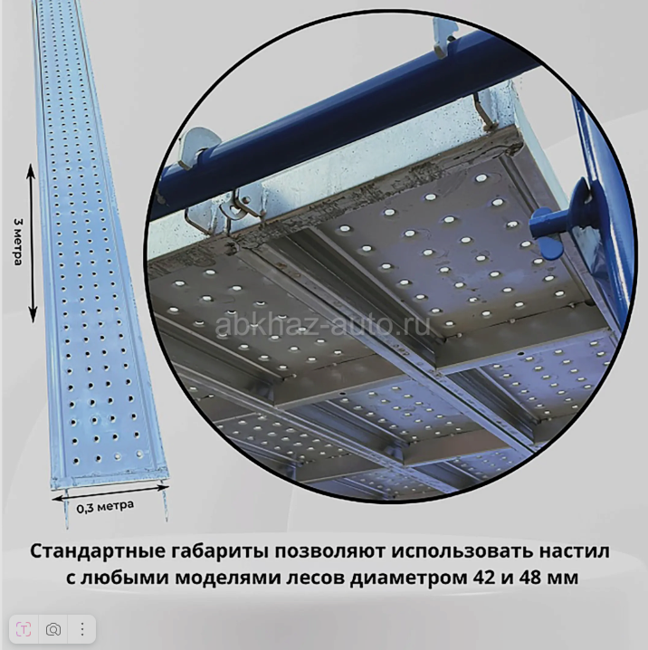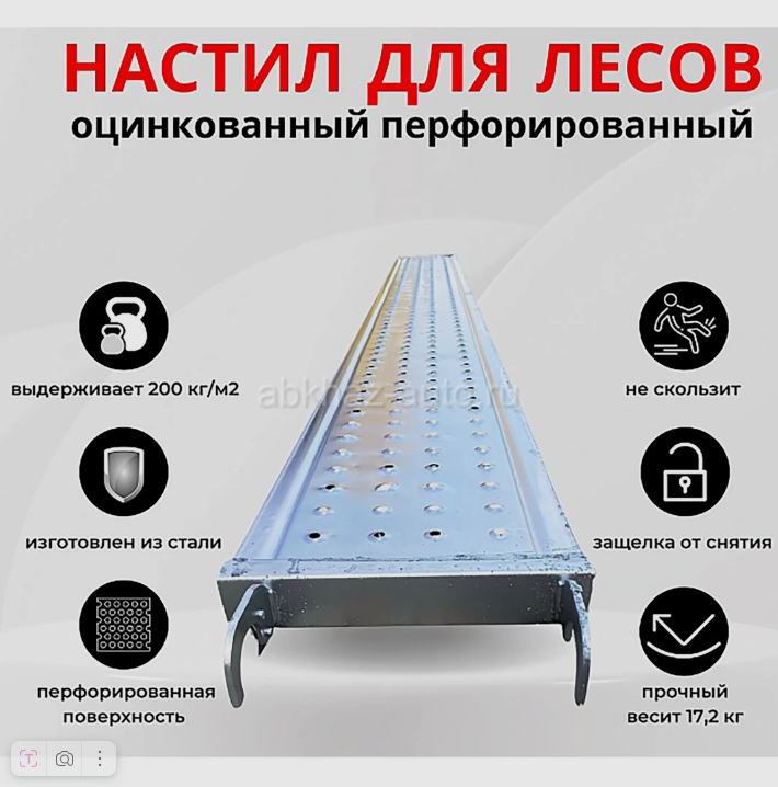 Дополнительная информация: Настил перфорированный оцинкованный для строительных лесов ЛРСП 0,3х3,0 м ВхШхГ, мм 3000х300х50 Вес, кг 17.18 используется в работе с большими нагрузками: при каменной или кирпичной кладке, а также при повышенных требованиях безопасности. Выдерживает нормативную нагрузку до 200 кг/м2. Прочность и надежность настила обеспечивает изготовление из стали толщиной 1,5 мм. Швы выполнены полуавтоматической сваркой. Перфорированная поверхность предотвращает скольжение и соответственно травматизм рабочих. Настил прошел процесс горячей оцинковки и не подвержен коррозии, что существенно продлевает срок службы. Универсальный размер креплений позволяет использовать настил с различными диаметрами трубы лесов: от 42 до 48 мм. Благодаря чему металлический оцинкованный настил подходит и для классических рамными, и для хомутовых лесов. Крепления дополнены специальными замками-фиксаторами, предотвращающими срыв настила с трубы лесов.