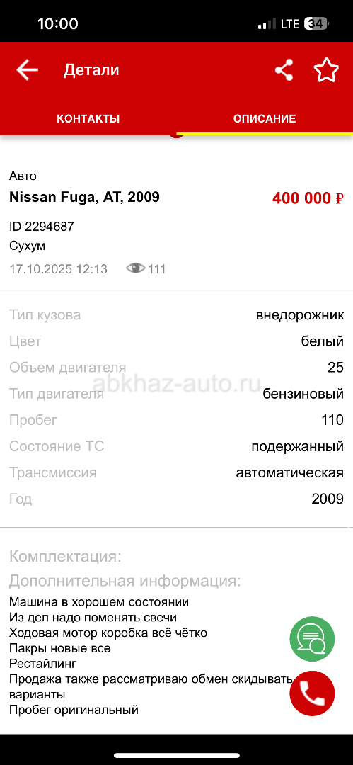 Двигатель: бензиновый, 25 л Трансмиссия: автоматическая Кузов: внедорожник Цвет: белый Пробег: 113 км Год выпуска: 2008 Регион: Сухум Дополнительная информация: В норм состоянии Также интересует обмен с моей доплатой Варианты скидывать