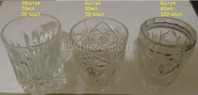Дополнительная информация: Стопка (стаканчик) 70мл. Стекло. 28шт, 20р/шт. 80мл. 6шт, 30р/шт. 40мл. Хрусталь. 8шт, 100р/шт. Сделано в СССР.