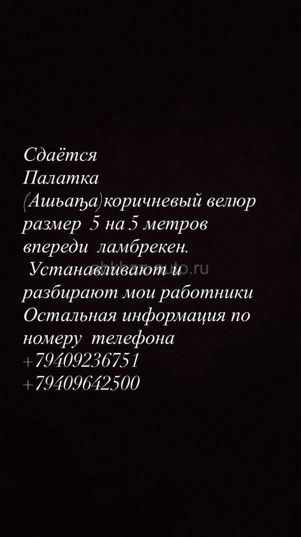 Дополнительная информация: Сдаётся (Ритуальная палатка Ашьаҧа ) коричневый велюр размер 5 на 5 метров впереди ламбрекен. Устанавливают и разбирают мои работники Остальная информация по номеру телефона +79409236751 + 79409642500