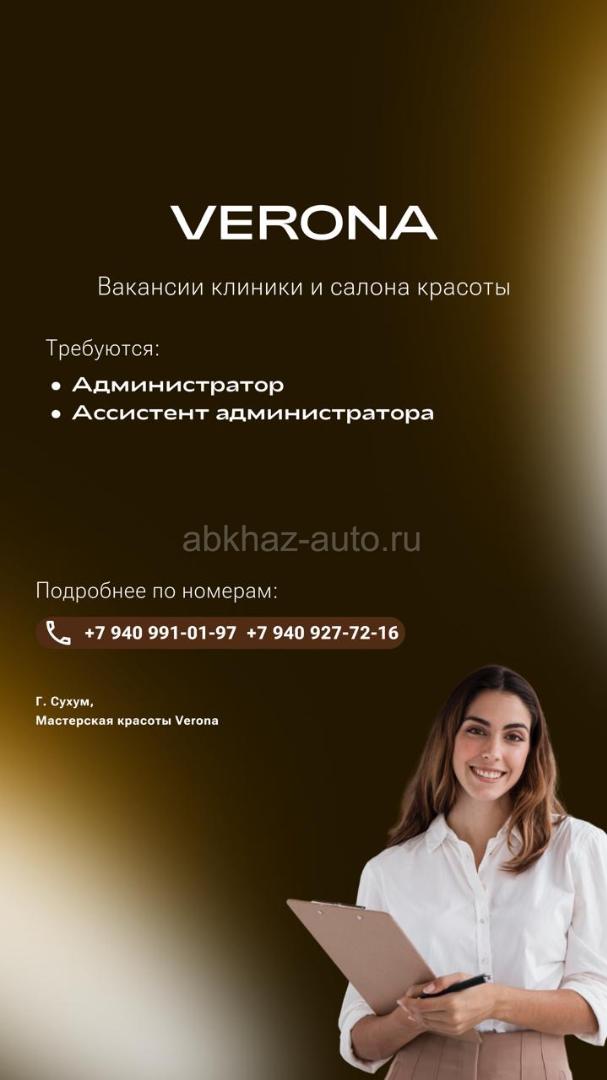 Дополнительная информация: ОТКРЫТЫ ВАКАНСИИ В МАСТЕРСКУЮ КРАСОТЫ VERONA! - Администратор. График работы 2/2, доход от 40 тыс. рублей. Стажировка 2 недели - Ассистент администратора. График работы 2/2, доход 2 тыс. рублей за выход. 📍г. Сухум, ул. Аргун, 10. Конфедератов, д. 26 По всем вопросам звоните по номерам ниже: 📲+7 940 991-01-97 +7 940 927-72-16
