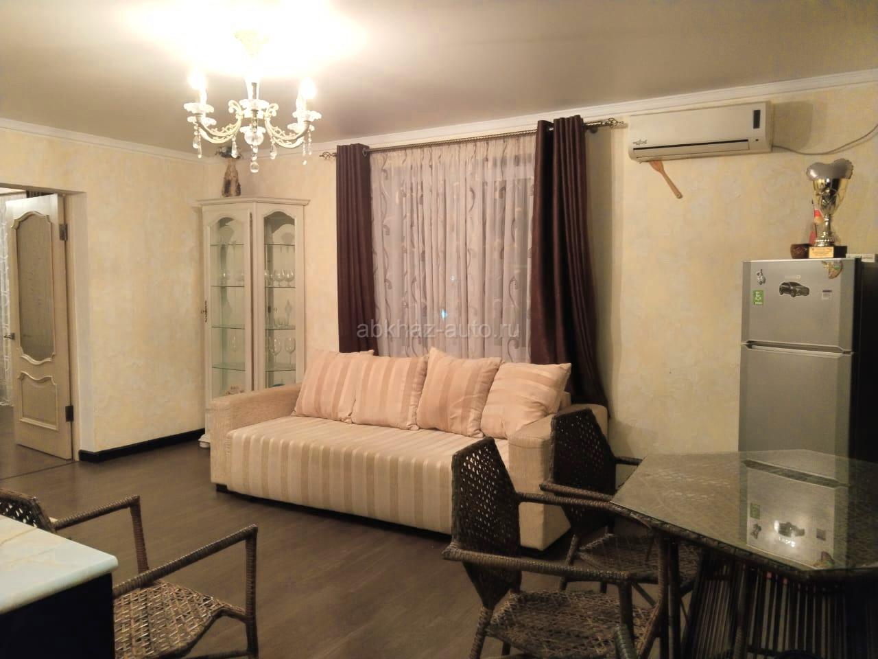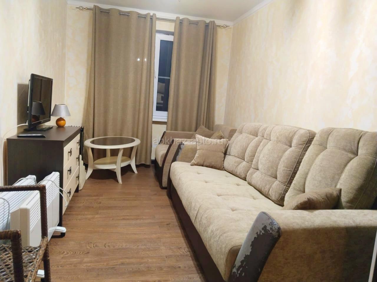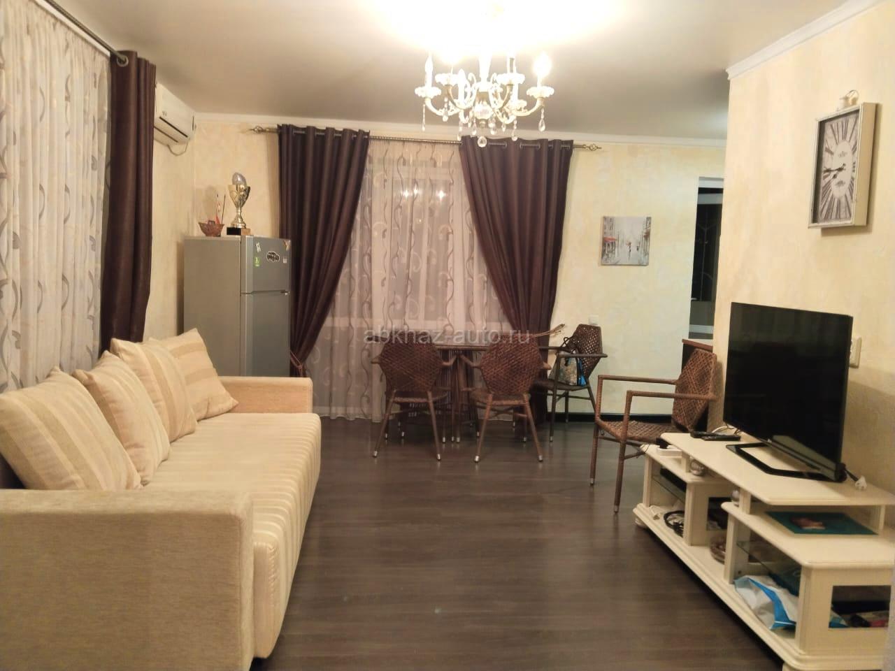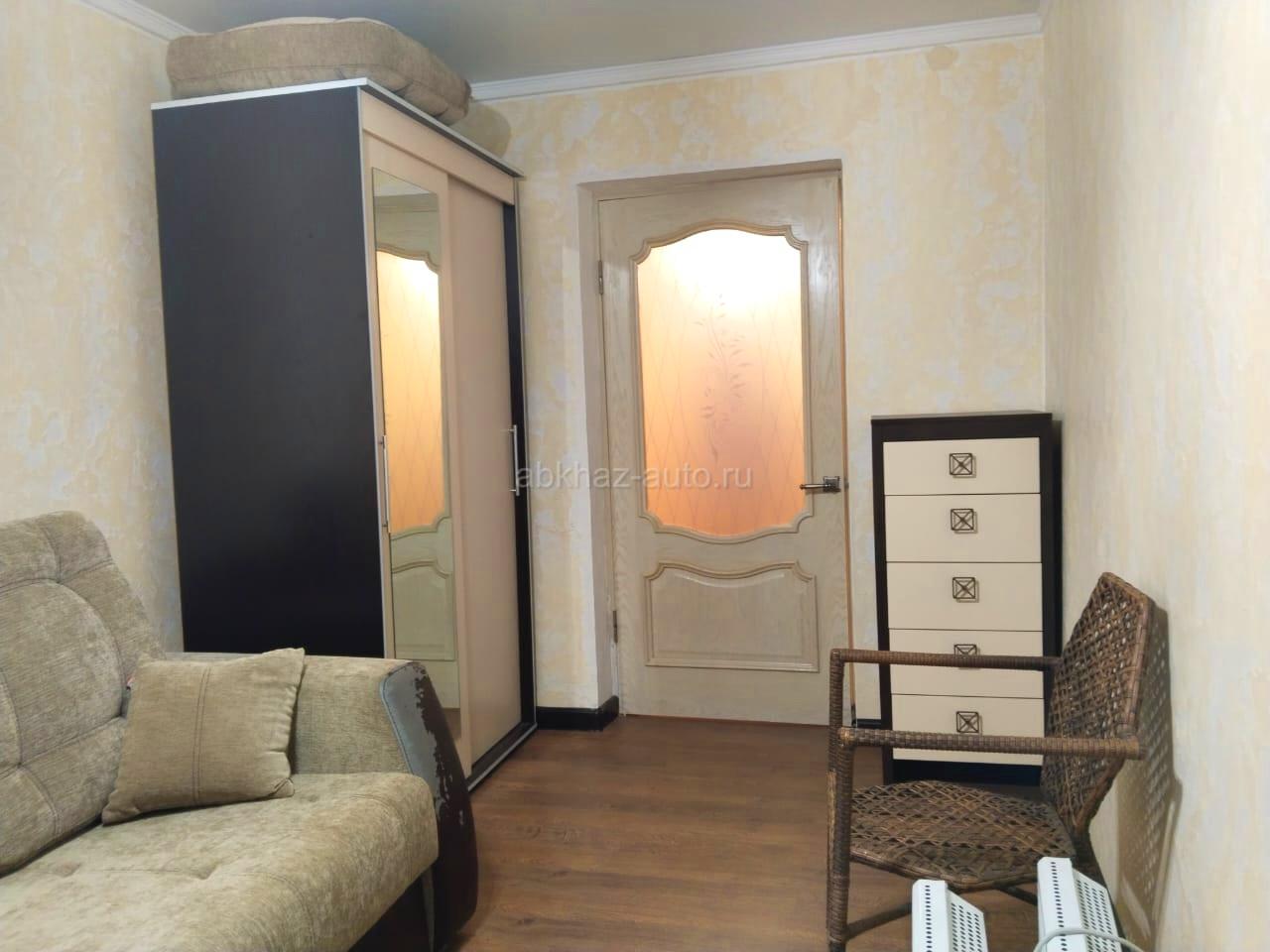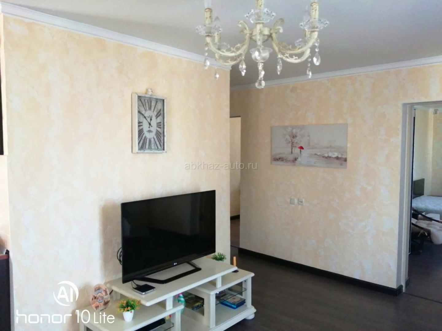 Дополнительная информация: Светлая, уютная 3-х комнатная квартира, с качественным ремонтом, мебелью. Расположена в п.Агудзера (дом при въезде), этаж 4 Две изолированные комнаты: спальная и кабинет(детская). Просторная гостиная-студия с кухонной зоной и выходом на просторный балкон, ванная с санузлом совмещенные. WiFi Общая площадь: 70,8м2, в том числе жилая-48м2, вспом.-22,8м2. Балкон -около 3м2 Видео-обзор можно посмотреть по ссылке: https://youtu.be/LM7MXs1Dl_s