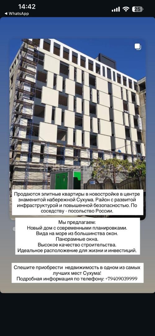 Дополнительная информация: Продаются элитные квартиры в новостройке в центре знаменитой набережной Сухума. Район с развитой инфраструктурой. По соседству - посольство России. Мы предлагаем: Новый дом с современными планировками. Вид на море из большинства окон. Панорамные окна. Высокое качество строительства. Идеальное расположение для жизни и инвестиций. Спешите приобрести недвижимость в одном из самых лучших мест Сухума! Подробная информация по телефону: +79409039999