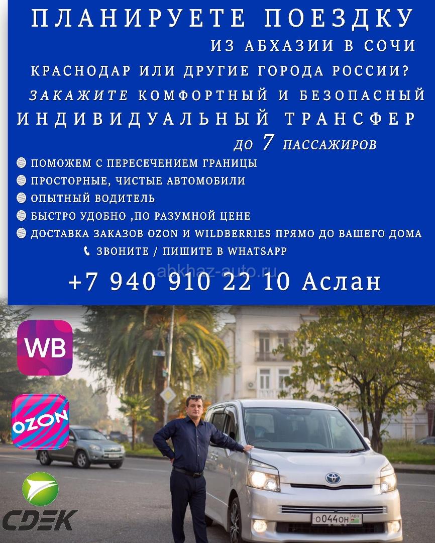 Дополнительная информация: ПЛАНИРУЕТЕ ПОЕЗДКУ ИЗ АБХАЗИИ В СОЧИ КРАСНОДАР ИЛИ ДРУГИЕ ГОРОДА РОССИИ? ЗАКАЖИТЕ КОМФОРТНЫЙ И БЕЗОПАСНЫЙ ИНДИВИДУАЛЬНЫЙ ТРАНСФЕР ДО 7 ПАССАЖИРОВ • ПОМОЖЕМ С ПЕРЕСЕЧЕНИЕМ ГРАНИЦЫ ПРОСТОРНЫЕ, ЧИСТЫЕ АВТОМОБИЛИ ОПЫТНЫЙ ВОДИТЕЛЬ БЫСТРО УДОБНО ,ПО РАЗУМНОЙ ЦЕНЕ ДОСТАВКА ЗАКАЗОВ OZON И WILDBERRIES ПРЯМО ДО ВАШЕГО ДОМА С ЗВОНИТЕ / ПИШИТЕ В WHATSAPP +7 940 910 22 10 Аслан