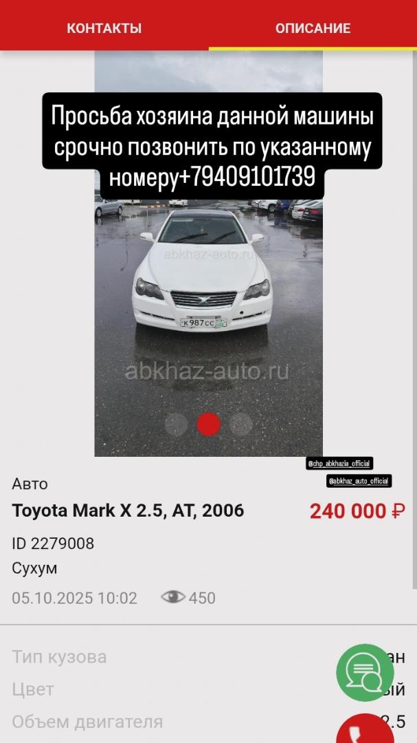 Двигатель: бензиновый, 30 л Трансмиссия: автоматическая Кузов: седан Цвет: белый Пробег: 11111111111 км Год выпуска: 2005 Регион: Сухум Дополнительная информация: Кто ездит на этой машине, срочно позвоните по номеру+79409101739, нет так утром машина будет в розыске...