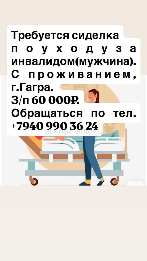 Дополнительная информация: Требуется сиделка по уходу за инвалидом(мужчина). С проживанием, г. Гагра. 3/п 60 000Р. Обращаться по тел.: +79409903624