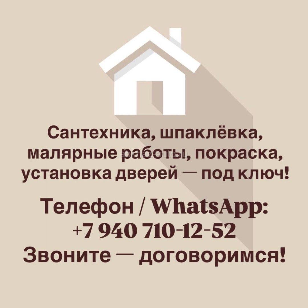 Дополнительная информация: 🏗 Сантехника, шпаклёвка, малярные работы, покраска, установка дверей — под ключ! Опытный мастер выполнит указанные виды ремонтных работ качественно, в срок и по договорённости. Виды работ: 🔹 Отделочные и малярные: — Штукатурка, шпаклёвка, покраска стен и потолков — Малярные работы (подготовка поверхностей, грунтовка, финишная отделка) 🔹 Сантехнические: — Установка и замена кранов, раковин, унитазов, ванн, душевых кабин — Монтаж труб, устранение протечек и засоров — Другие сантехнические услуги по договорённости 🔹 Установка дверей: — Монтаж межкомнатных и входных дверей — Регулировка, подгонка, установка фурнитуры Почему выбирают меня: ✅ Большой опыт и аккуратность в работе ✅ Работаю по договорённости и без посредников ✅ Помощь в закупке и доставке материалов ✅ Гарантия на выполненные работы 📞 Телефон / WhatsApp: +7 940 710-12-52 💬 Звоните — договоримся!