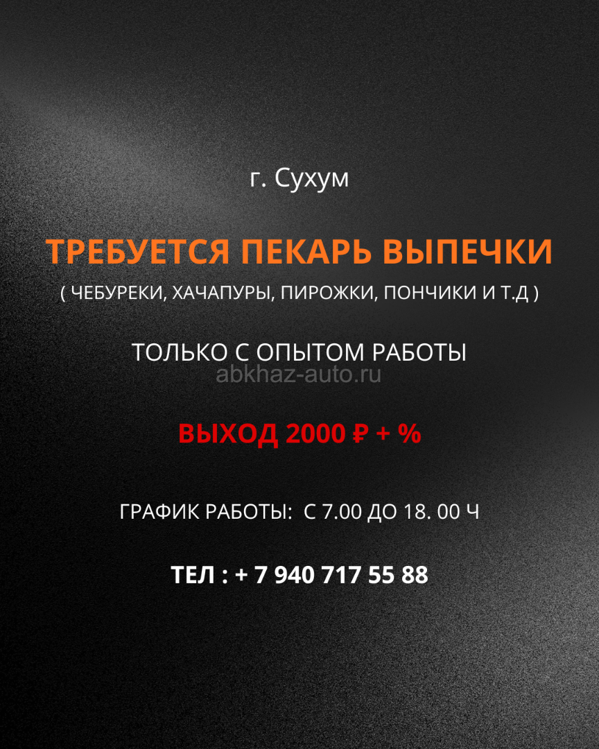 Дополнительная информация: г. Сухум ТРЕБУЕТСЯ ПЕКАРЬ ВЫПЕЧКИ (ЧЕБУРЕКИ. ХАЧАПУРЫ, ПИРОЖКИ, ПОНЧИКИ И Т.Д) ТОЛЬКО С ОПЫТОМ РАБОТЫ ВЫХОД 2000Р+% ГРАФИК РАБОТЫ: С 7.00 ДО 18. 00 Ч TEЛ:+7 940 717 55 88