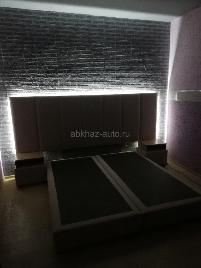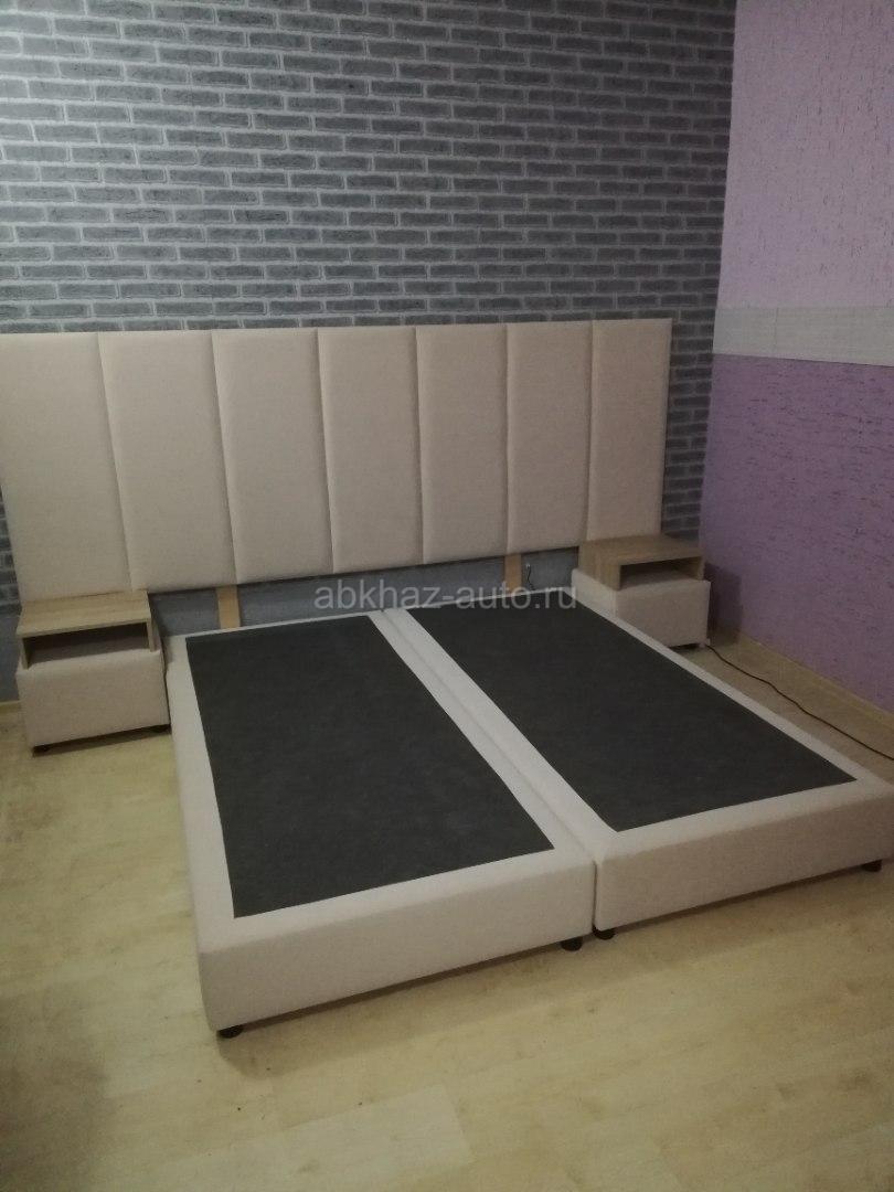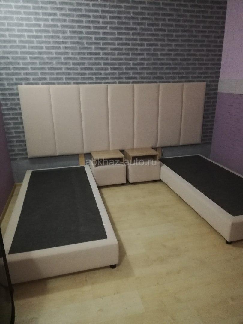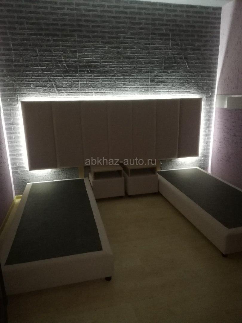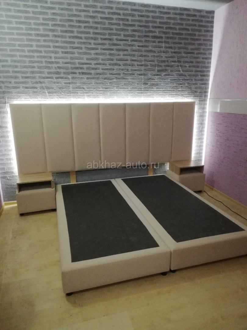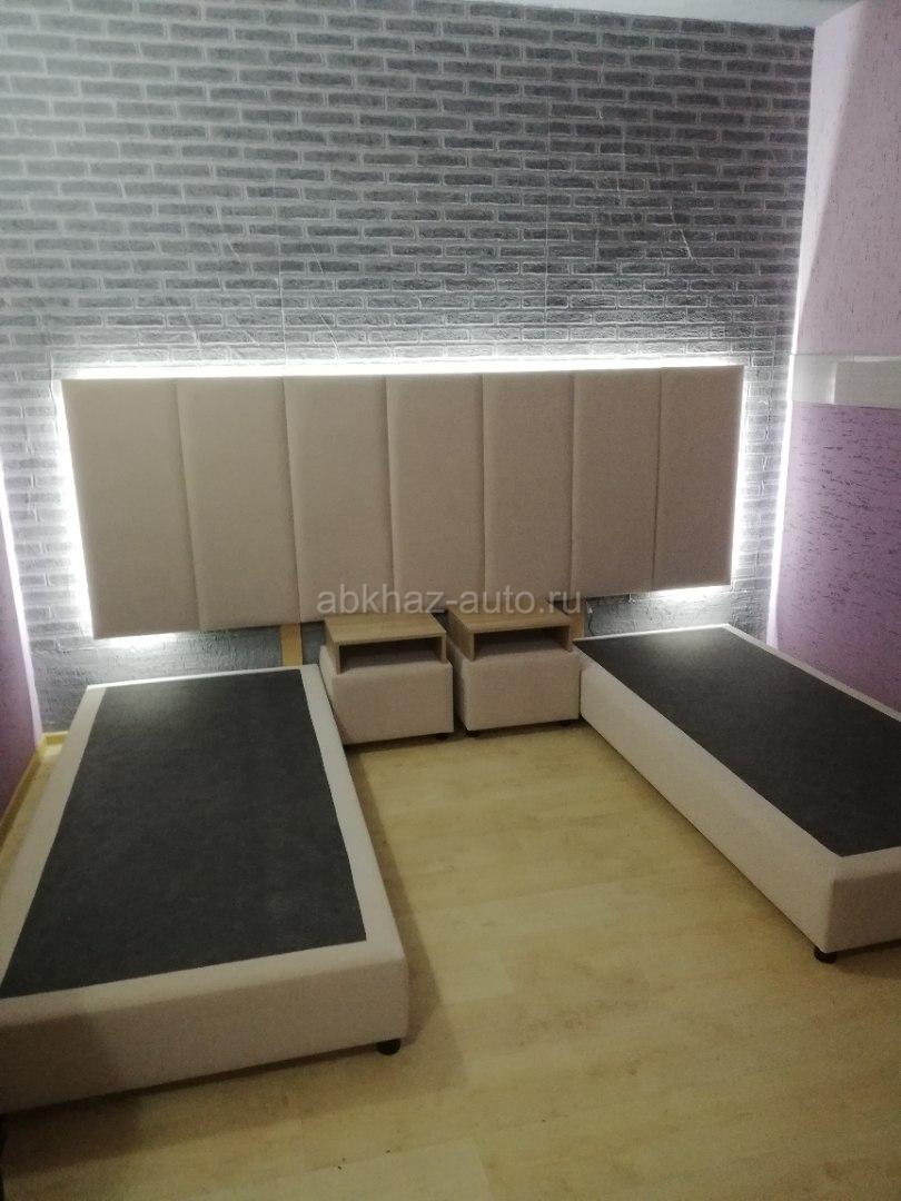 Дополнительная информация: 2 односпальные кровати 90см*200см, в комплекте 2 прикроватные тумбочки с выкатными ящиками. Изголовье с подсветкой размером 280см/100см.кровати можно установить в одну кровать 180см/200см.материал исполнения бежевый бархат. Все новое.