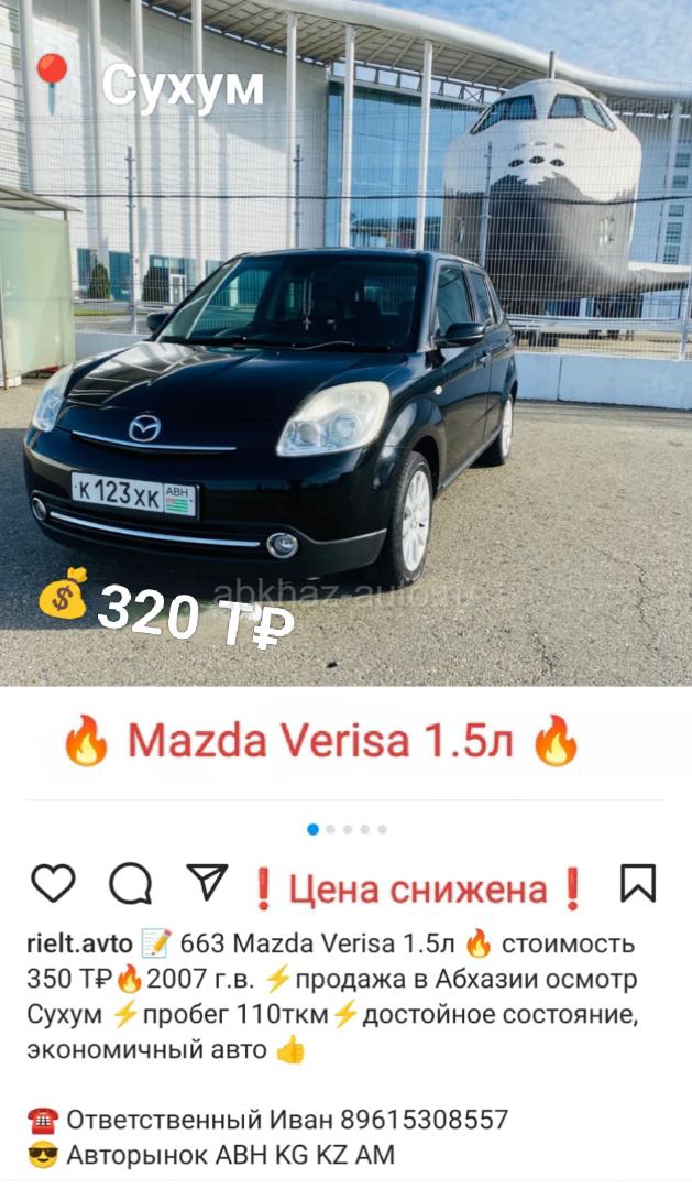 Двигатель: бензиновый, 1.5 л Трансмиссия: автоматическая Кузов: хэтчбэк Цвет: черный Пробег: 110 км Год выпуска: 2007 Регион: Сухум Дополнительная информация: 📝 Mazda Verisa 1.5л 🔥 стоимость 320 Т₽🔥2007 г.в. ⚡продажа в Абхазии осмотр Сухум ⚡пробег 110ткм⚡достойное состояние, экономичный авто 👍 ☎ Ответственный Иван 89615308557