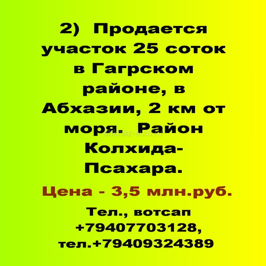 Дополнительная информация: 2) Продается участок 25 соток в Гагрском районе, в Абхазии, 2 км от моря. Район Колхида- Псахара. На участке стоит домик-бытовка. Есть домовая книга. Цена - 3,5 млн.руб. На участке растут цитрусовые деревья, другие плодовые деревья. Которые приносят несколько тонн урожая. Тел., вотсап +79407703128, тел.+79409324389
