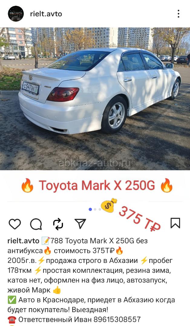 Двигатель: бензиновый, 2.5 л Трансмиссия: автоматическая Кузов: седан Цвет: белый Пробег: 178 км Год выпуска: 2005 Регион: Вся Абхазия Дополнительная информация: 📝Toyota Mark X 250G без антибукса🔥 стоимость 375Т₽🔥2005г.в.⚡продажа строго в Абхазии ⚡пробег 178ткм ⚡простая комплектация, резина зима, катов нет, оформлен на физ лицо, автозапуск, живой Марк 👍 ✅ Авто в Краснодаре, приедет в Абхазию когда будет покупатель! Выездная! ☎ Ответственный Иван 89615308557