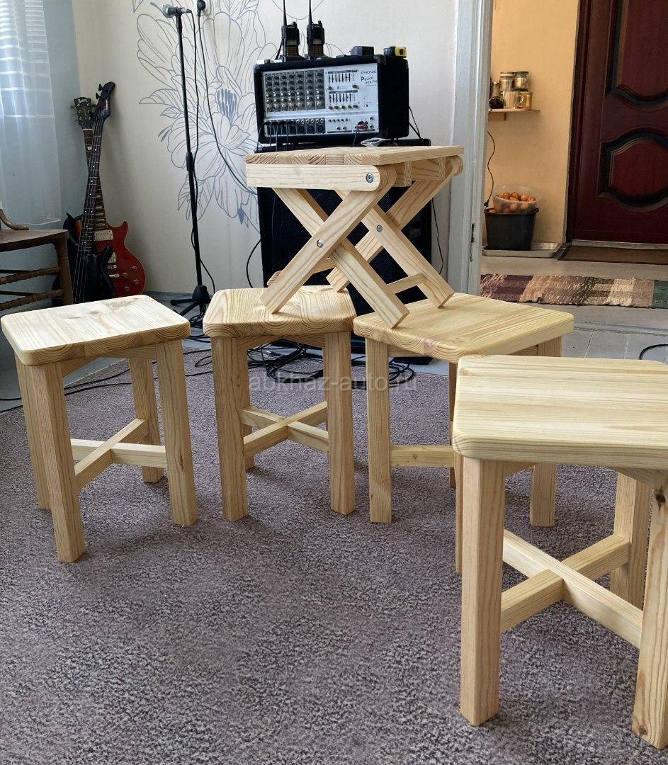 Дополнительная информация: Новые деревянные табуретки прочной конструкции. Размеры: -Обычная табуретка : высота 43 см., верх 31×31 -Складная табуретка: высота 31 см., верх 30×30 Можем изготовить раскладной столик. Цена : -Обычная табуретка за 1 шт.-1200 руб., -Складная табуретка (раскладной стульчик)-1000руб. -От четырех штук - скидка. Можно изготовить на заказ любое количество и по вашим размерам. А так же изготовим любую мебель из дерева (столы/скамейки/детскую мебель) окна из дерева под заказ. Возможна доставка. Звоните, пишите на ватсап +79625692867