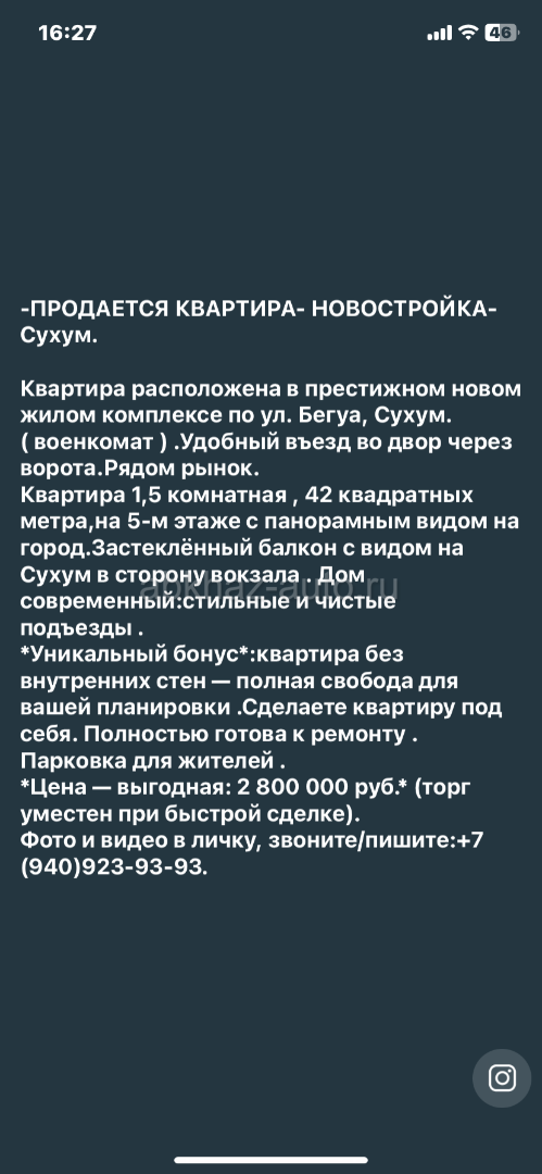 Дополнительная информация: Сухум, ул Бегуа, ( военкомат) новостройка ,1,5 комнатная, 42 квадратных метра. 5 этаж , балкон застекленный , въезд во двор через ворота, парковка , красивый ,стильный дом и подъезд . .Все чисто аккуратно и красиво . Вид с балкона на вокзал . Рядом рынок и все необходимое . . Квартира без внутренних стен - свободная планировка на ваш вкус . При быстрой сделке - торг . Все вопросы по телефону 79409239393