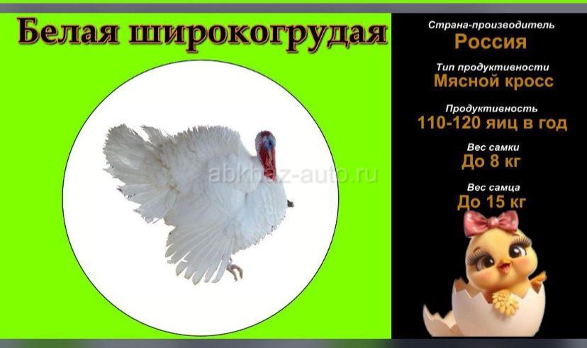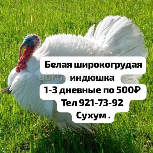 Дополнительная информация: Принимаю заявки на Индюшек февраль, март, апрель . Породы : Белая широкогрудая и Северокавказкая бронза Суточные , трёхдневные и пятидневные. Стоимость от 500 ₽ и выше. Город Сухум. За дополнительной информацией обращаться по номеру или писать на WhatsApp 7 940 921 -73 -92