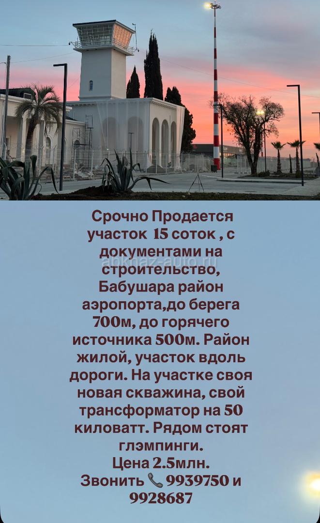 Дополнительная информация: Срочно Продается участок 15 соток , с документами на строительство, Бабушара район аэропорта,до берега 700м, до горячего источника 500м. Район жилой, участок вдоль дороги. На участке своя новая скважина, свой трансформатор на 50 киловатт. Рядом стоят глэмпинги. Цена 2.5млн. Звонить 📞 9939750 и 9928687