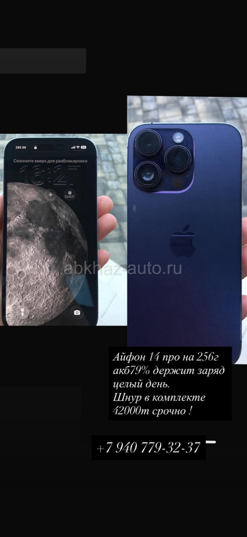 Дополнительная информация: Продаю 14 про на 256г 79% аккумулятор держится очень хорошо, все свое родное . Шнур в комплекте. Не вскрывался , не глючит . 42000т либо обмен с вашей доплатой Минимальный торг