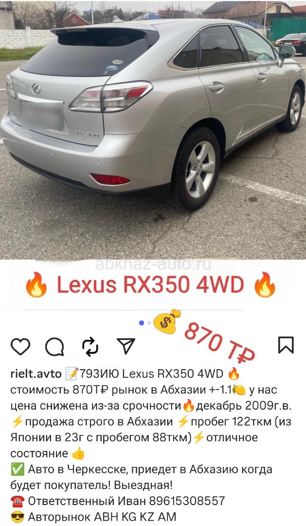 Двигатель: бензиновый, 3.5 л Трансмиссия: автоматическая Кузов: внедорожник Цвет: серебристый металлик Пробег: 122 км Год выпуска: 2009 Регион: Вся Абхазия Дополнительная информация: 📝 Lexus RX350 4WD 🔥 стоимость 870Т₽ рынок в Абхазии +-1.1🍋 у нас цена снижена из-за срочности🔥декабрь 2009г.в. ⚡продажа строго в Абхазии ⚡пробег 122ткм (из Японии в 23г с пробегом 88ткм)⚡отличное состояние 👍 ✅ Авто в Черкесске, приедет в Абхазию когда будет покупатель! Выездная! ☎ Ответственный Иван 89615308557