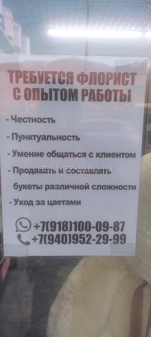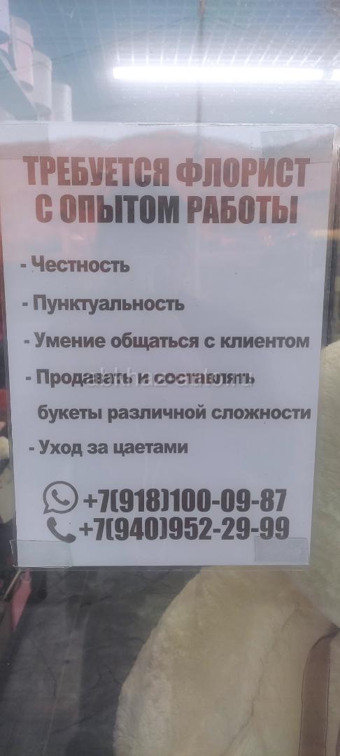 Дополнительная информация: Приглашаем на работу ~ Честных ~ Пунктуальных ~ Уменя обращаться с клиентами ~ Продавца и Уменя собрать букеты разной сложности. ~ Уход за цветами.