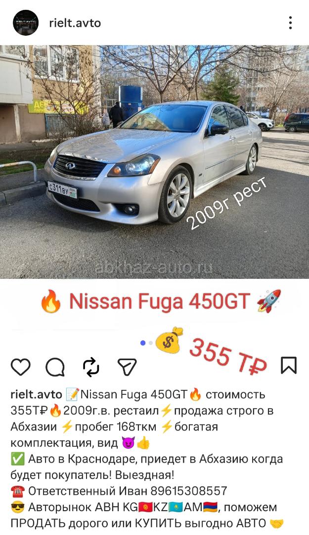 Двигатель: бензиновый, 4.5 л Трансмиссия: автоматическая Кузов: седан Цвет: белый Пробег: 168 км Год выпуска: 2009 Регион: Вся Абхазия Дополнительная информация: Живая Фуга, выглядит бомба, едет ещё лучше. Самый надёжный мотор V8. Богатая комплектация. Чёткие диски, резина Мишлен. Что ещё надо?