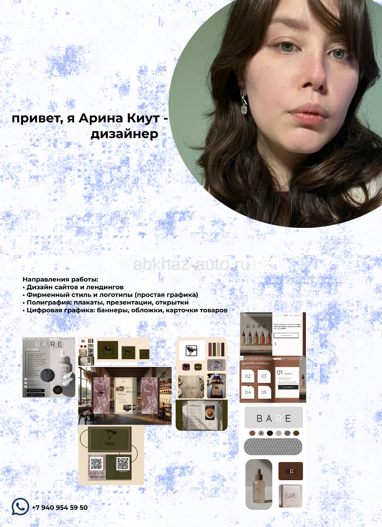 Дополнительная информация: Я создаю чистые, осмысленные визуальные решения, где на первом месте — ясность сообщения и атмосфера. Моя сила — в работе с типографикой, композицией и минималистичной эстетикой. Верю, что хороший дизайн говорит тихо, но убедительно. Направления работы: • Дизайн сайтов и лендингов • Фирменный стиль и логотипы (простая графика) • Полиграфия: плакаты, презентации, открытки • Цифровая графика: баннеры, обложки, карточки товаров Подход: Я погружаюсь в задачу, чтобы понять её суть, и трансформирую идею в строгие визуальные формы. Работаю итеративно, открыта к диалогу и точечным правкам