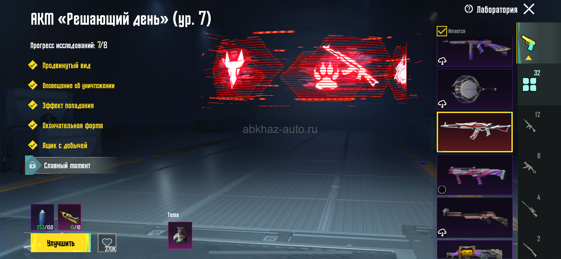 Дополнительная информация: акк с 4 сезона, 87 левл , имеется 32 улучшаемых оружия, 10 килчатов , 4 золотых костюма , 9200 очков достиж. 2.5 млн. пп , багги и бигфут с килчатом , на акке имеется 13 материалов и 6 к юси, фул обзор через коллекцию айди 5279593401 без обмена только продажа цена 30 тыс. ватсап 7152524