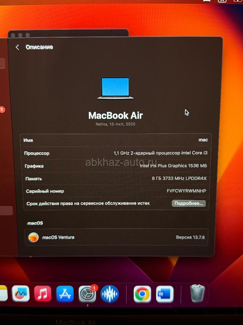 Дополнительная информация: Продаю MacBook Air 2020 года в хорошем состоянии. Retina 13 дюймов, процессор Intel Core i3 с частотой 1.1 ГГц и встроенная видеокарта Intel Iris Plus Graphics. Оперативная память 8 ГБ, SSD-накопитель — 250 ГБ. Есть небольшие царапины на корпусе и один небольшой дефект (точечка) на экране - все сфоткано в обявлении Пользовалась аккуратно, все функции работают. Продаю потому что купила новый Клавиатура с русскоязычной раскладкой, аккумулятор держит заряд больше 4 часов. В комплекте идет оригинальное зарядное устройство, у провода нет оплетки.