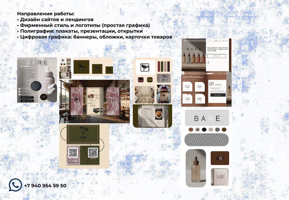 Дополнительная информация: Я создаю чистые, осмысленные визуальные решения, где на первом месте — ясность сообщения и атмосфера. Моя сила — в работе с типографикой, композицией и минималистичной эстетикой. Верю, что хороший дизайн говорит тихо, но убедительно. Направления работы: • Дизайн сайтов и лендингов • Фирменный стиль и логотипы (простая графика) • Полиграфия: плакаты, презентации, открытки • Цифровая графика: баннеры, обложки, карточки товаров Подход: Я погружаюсь в задачу, чтобы понять её суть, и трансформирую идею в строгие визуальные формы. Работаю итеративно, открыта к диалогу и точечным правкам Мой ватсапп +7 940 954 59 50