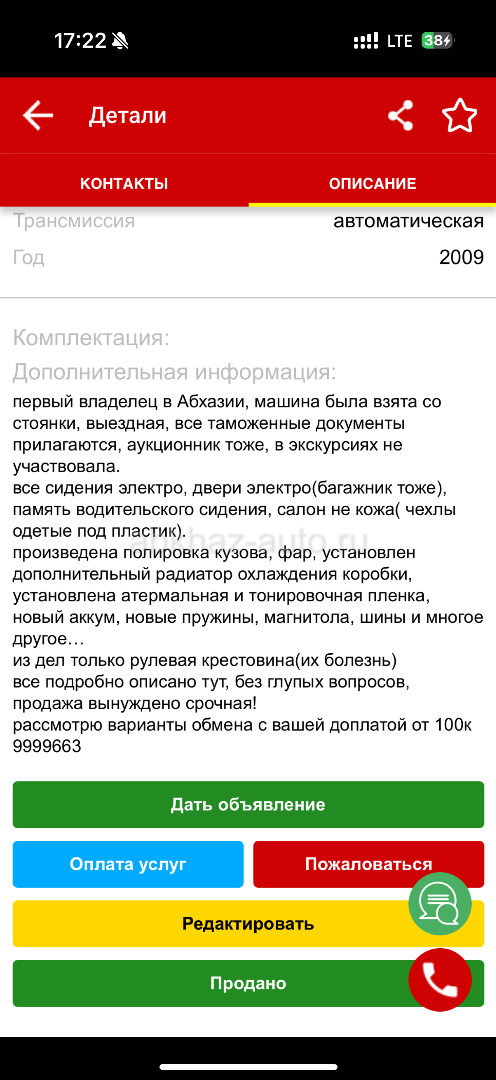 Двигатель: бензиновый, 3.5 л Трансмиссия: автоматическая Кузов: минивэн Цвет: черный Пробег: 128 км Год выпуска: 2009 Регион: Сухум Дополнительная информация: срочно!!! без глупых вопросов, все указано в последнем фото