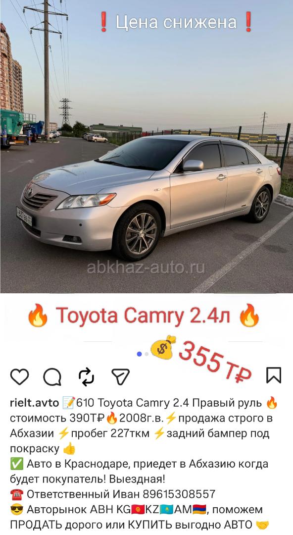 Двигатель: бензиновый, 2.4 л Трансмиссия: автоматическая Кузов: седан Цвет: серебристый металлик Пробег: 225 км Год выпуска: 2008 Регион: Вся Абхазия Дополнительная информация: Цена край 355тр. Обмен только на деньги! 📝 Toyota Camry 2.4 Правый руль 🔥 стоимость 355Т₽🔥2008г.в.⚡продажа строго в Абхазии ⚡пробег 227ткм ⚡задний бампер под покраску, рейка чуть постукивает ✅ Авто в Краснодаре, приедет в Абхазию когда будет покупатель! Выездная! ☎ Ответственный Иван 89615308557