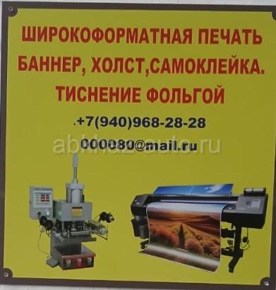 Дополнительная информация: Печать на самоклеющейся пленке, печать баннеров , печать на холсте, тиснение фольгой. Обращаться в рекламное агенство, прямо на против Горсовета г Сухум.