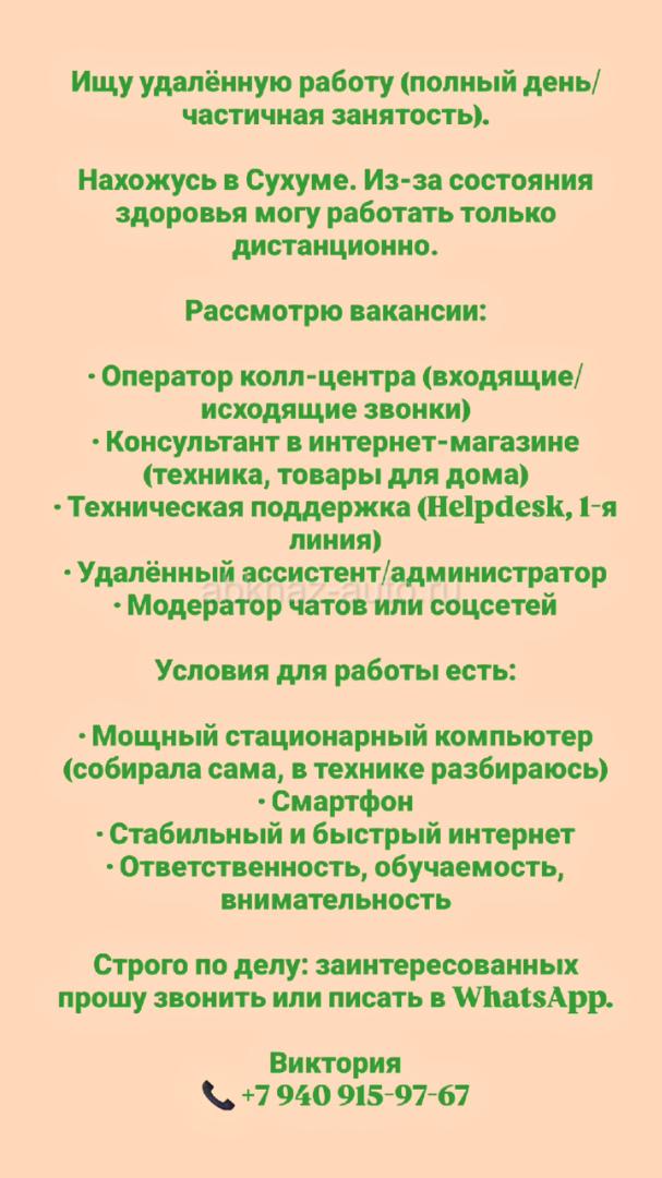 Дополнительная информация: Ищу удалённую работу. Разбираюсь в технике, есть ПК и интернет. Рассмотрю: оператора, консультанта, помощника, поддержку. 📞 +7 940 915-97-67 (Виктория)