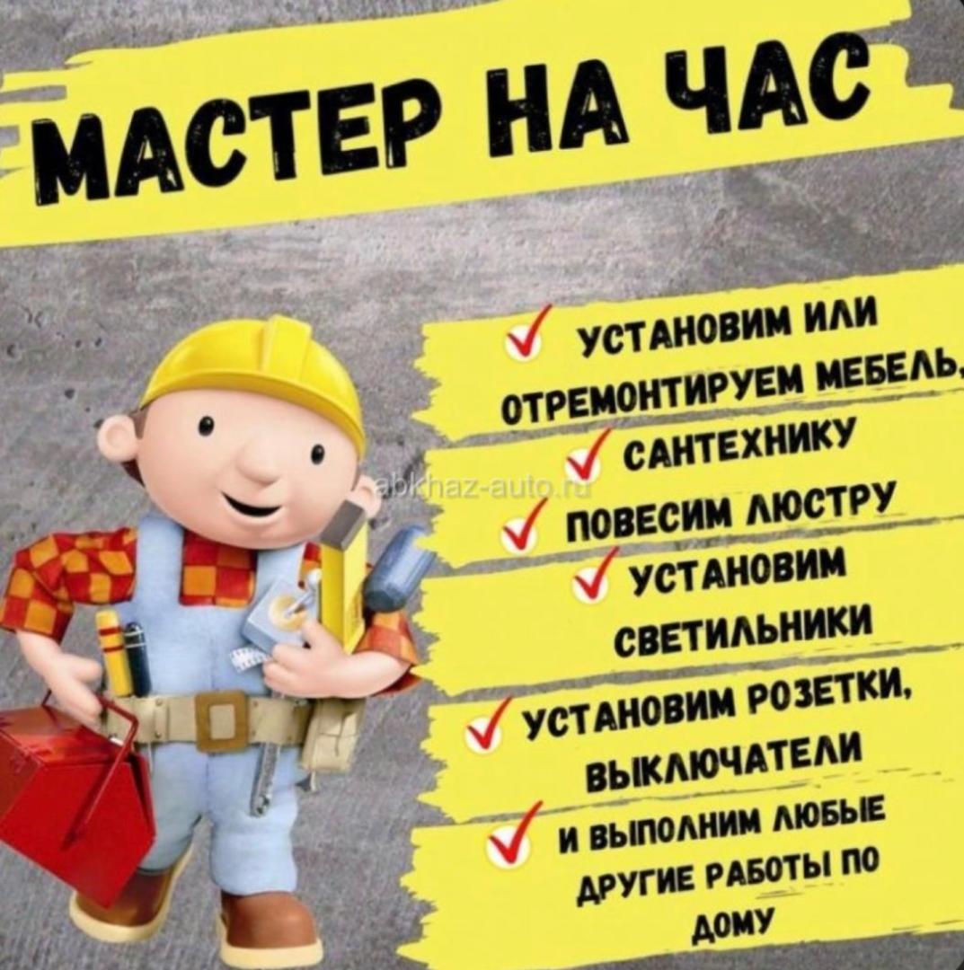 Дополнительная информация: Предлагаю вам свои услуги мастер на час Сантехника Электрика Сборка мебели (детская мебель,офисная мебель,кухонный гарнитур и т.д) Повесить гардины-светильники-люстры Устранить любые неполадки Любые другие работы по дому-квартире Гагры-Пицунда-Цандрипш Ближайшие рядом обсуждаются 🚗