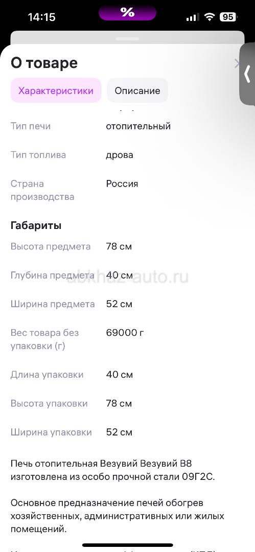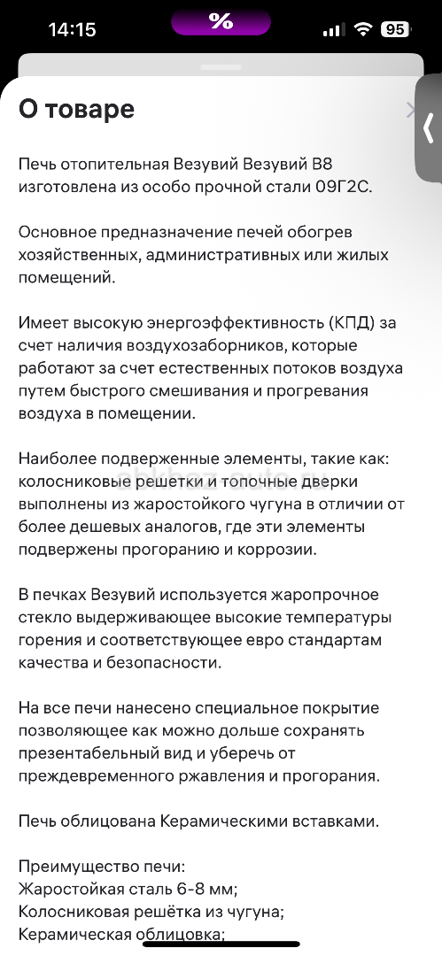 Дополнительная информация: Печь отопительная Везувий В8 изготовлена из особо прочной стали 09Г2С.