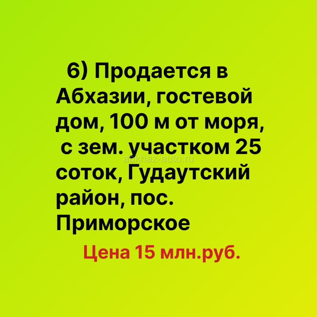 Дополнительная информация: 6) Продается в Абхазии, 100 м от моря гостевой дом 100 кв.м + 2 отдельные гостевые комнаты с участком 25 соток, недалеко от Нового Афона, Пос. Приморское. Цена 15 млн.руб. Тел., вотсап +79407703128. Ремонт средний. В доме 3 спальни + зал и столовая, санузел. Во всех комнатах кондиционеры, обогреватели. В зале спутниковая антенна ТРИКОЛОР. Есть действующий камин. С балкона открывается вид на море. На участке есть отдельная летняя кухня. Мебель и бытовая техника - все остается покупателю. На участке множество фруктовых деревьев, недалеко транспортная остановка. Недалеко находится лечебный источник. Данный объект отлично подходит как для частного проживания, так и для гостевого бизнеса.