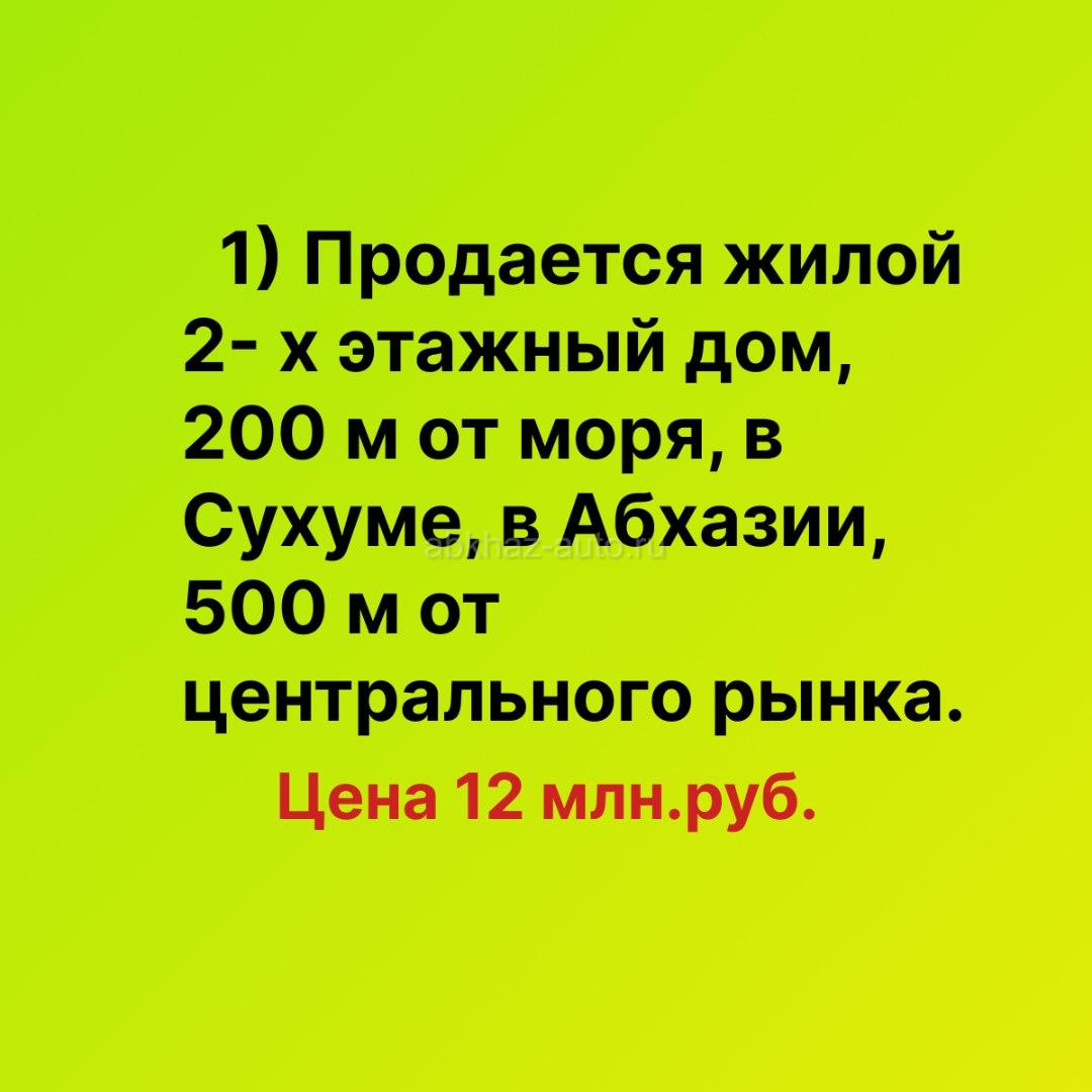 Дополнительная информация: 1) Продается жилой дом у моря в Сухуме, в Абхазии. 2- х этажный жилой дом с советским ремонтом, на участке 4 сотки. Тел., вотсап +79407703128 Сам дом большой капитальный. Расстояние 200 м от Черного моря, 500 м от центрального рынка. В доме 6 комнат. 2 -ой этаж -жилой, на 1-ом этаже нужен ремонт. Можно при желании превратить дом в мини гостиницу. Дом расположен в спокойном месте, и при этом транспортная остановка в 80 м от дома. Очень уютный и спокойный для жизни и отдыха жилой район. Цена 12 млн.руб.