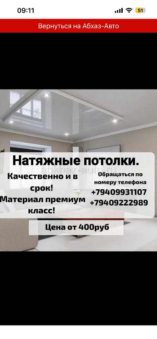Дополнительная информация: Натяжные потолки. Качественно и в срок. Материал премиум класс. Обращаться по номеру телефона +79409931107 +79409222989 Гал Очамчира Сухум Цена от 400руб