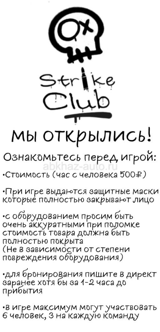 Дополнительная информация: По поводу брони писать в инстаграм strike_club_abh или на номер телефона в вацап, недорогой, надежный, безопасный (500 с человека за час)
