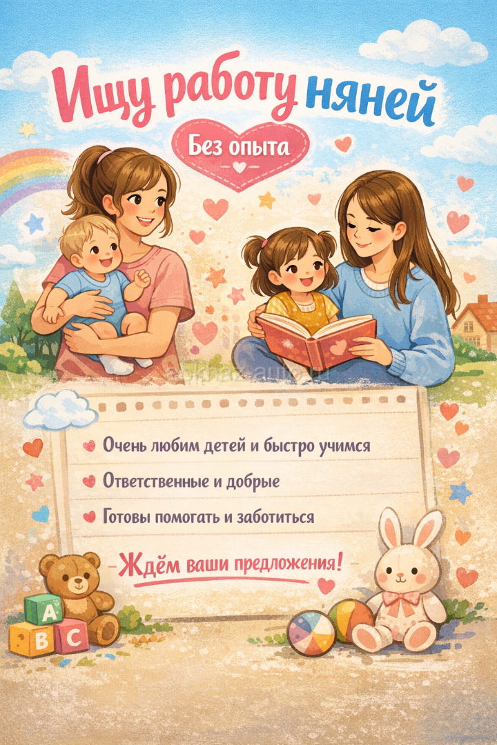 Дополнительная информация: Ищем работу нянями. Профессионального опыта нет, но есть искренняя любовь к детям, терпение и желание заботиться. Относимся к детям с вниманием и теплом, ответственно подходим к любым обязанностям. Готовы учиться и подстраиваться под потребности семьи. Работаем вместе звонить и писать +7 940 957-02-67