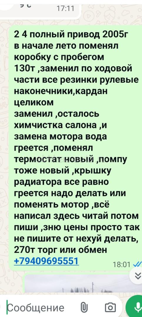 Двигатель: бензиновый, 24 л Трансмиссия: автоматическая Кузов: минивэн Цвет: серый Пробег: 111 км Год выпуска: 2005 Регион: Вся Абхазия Дополнительная информация: 2 4 полный привод 2005г в начале лето поменял коробку с пробегом 130т ,заменил по ходовой части все резинки рулевые наконечники,кардан целиком заменил ,осталось химчистка салона ,и замена мотора вода греется ,поменял термостат новый ,помпу тоже новый ,крышку радиатора все равно греется надо делать или поменять мотор ,всё написал здесь читай потом пиши ,зню цены просто так не пишите от нехуй делать, 270т торг или обмен +79409695551 обмен на Хонду фит