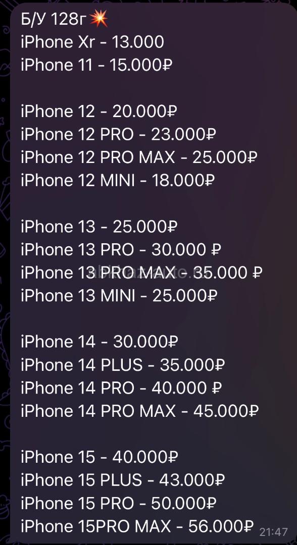 Дополнительная информация: Б/У 128г💥 iPhone Xr - 13.000 iPhone 11 - 15.000₽ iPhone 12 - 20.000₽ iPhone 12 PRO - 23.000₽ iPhone 12 PRO MAX - 25.000₽ iPhone 12 MINI - 18.000₽ iPhone 13 - 25.000₽ iPhone 13 PRO - 30.000 ₽ iPhone 13 PRO MAX - 35.000 ₽ iPhone 13 MINI - 25.000₽ iPhone 14 - 30.000₽ iPhone 14 PLUS - 35.000₽ iPhone 14 PRO - 40.000 ₽ iPhone 14 PRO MAX - 45.000₽ iPhone 15 - 40.000₽ iPhone 15 PLUS - 43.000₽ iPhone 15 PRO - 50.000₽ iPhone 15PRO MAX - 56.000₽ Инстаграм:abh.apple