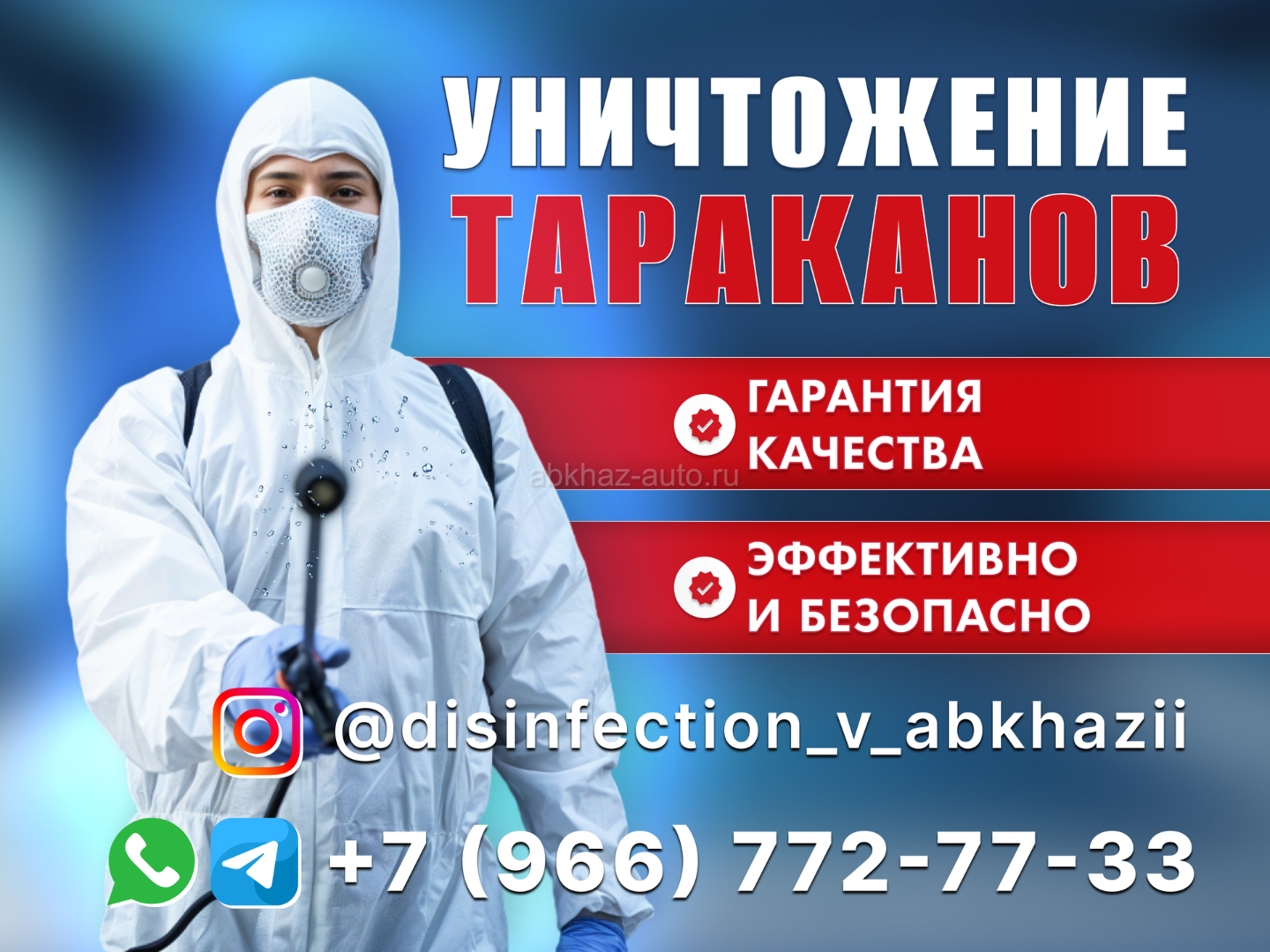 Дополнительная информация: Профессиональное уничтожение насекомых и грызунов. Гарантия.Круглосуточно. Любой район. Профессиональное оборудование (холодный туман, горячий туман, гели, озон и другое). В своей работе используем только проверенные и эффективные препараты. Проводим обработки любых жилых и не жилых помещений.+79667727733