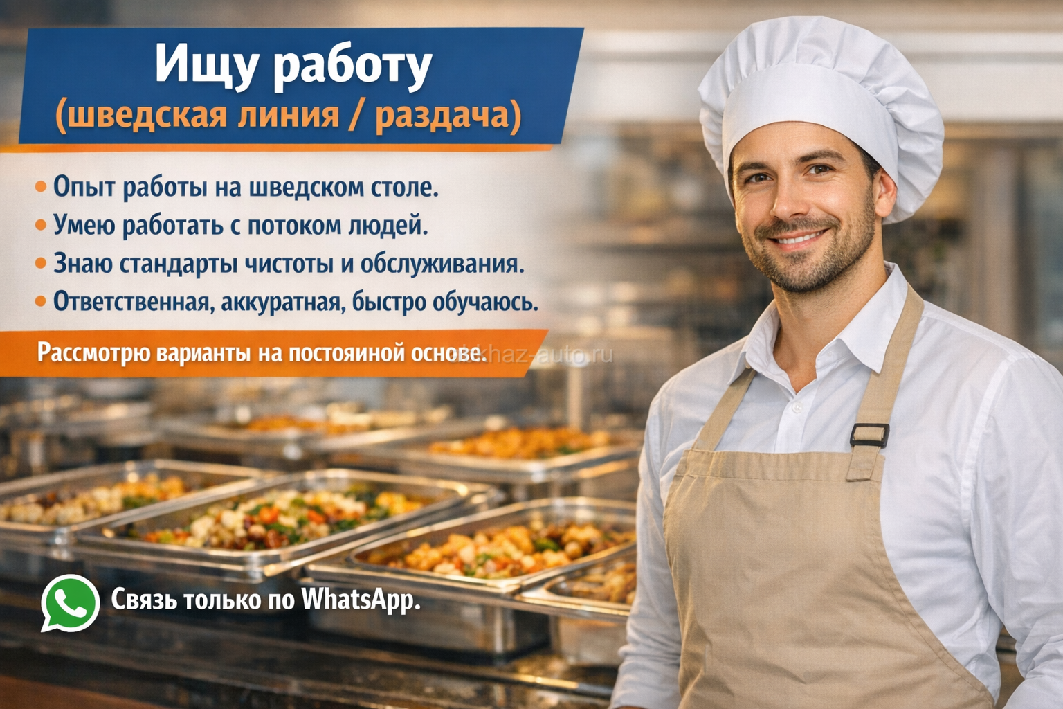 Дополнительная информация: Ищу работу на шведскую линию или на раздачу. Имею опыт работы, долгое время работала именно в сфере шведского стола. ✔ Умею работать с потоком людей ✔ Знаю стандарты чистоты и обслуживания ✔ Ответственная, аккуратная, быстро обучаюсь Рассмотрю варианты на постоянной основе. 📱 Связь только по WhatsApp: +7 940 914-33-35