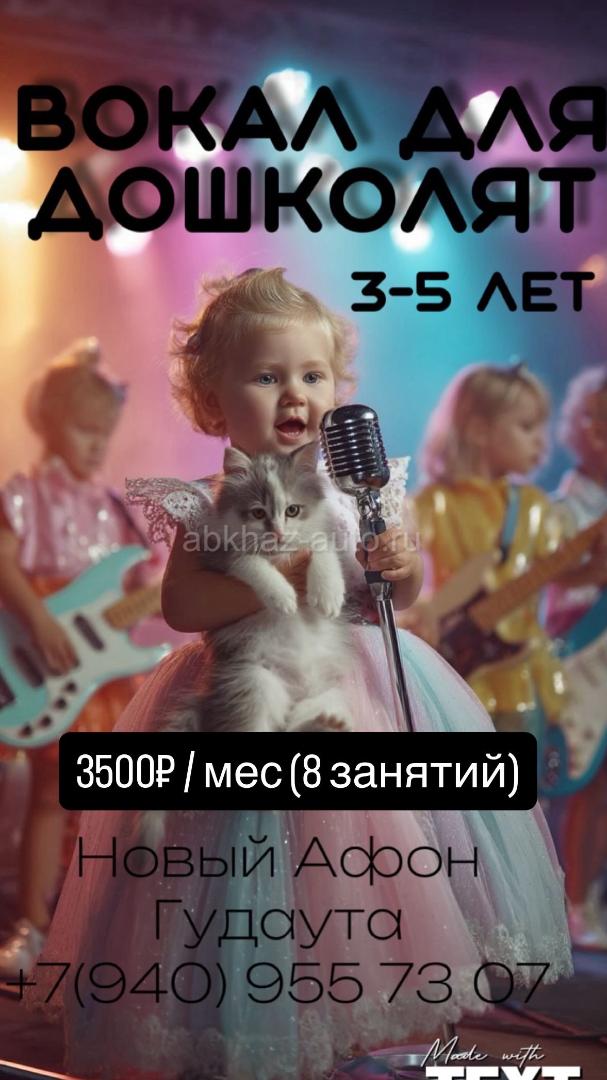 Дополнительная информация: Вокальная студия «Максимум» открывает набор занятий вокалом для ДОШКОЛЯТ (3-5 лет./ группа) Продолжительность занятий 1 час. На уроке отрабатываются: -ритмика -слух -дыхание -раскрепощение голоса Занятия улучшают речь, память, помогают снять эмоциональное напряжение и тренируют речевой аппарат. Занятия проходят в Новом Афоне и Гудауте. 2 раза в неделю (8 занятий) По всем вопросам обращайтесь по номеру +79409557307