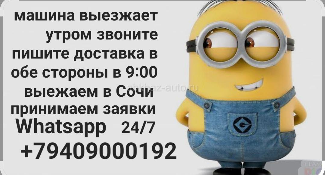 Доставка в обе стороны машина выезжает утром с Сухума в Сочи в 9:00 вы можете передать посылки в Сочи Адлер или попутно , мы собираем заявки 24/7 звоните пишите доставка посылок по всем городам Абхазии до дому прям в руки